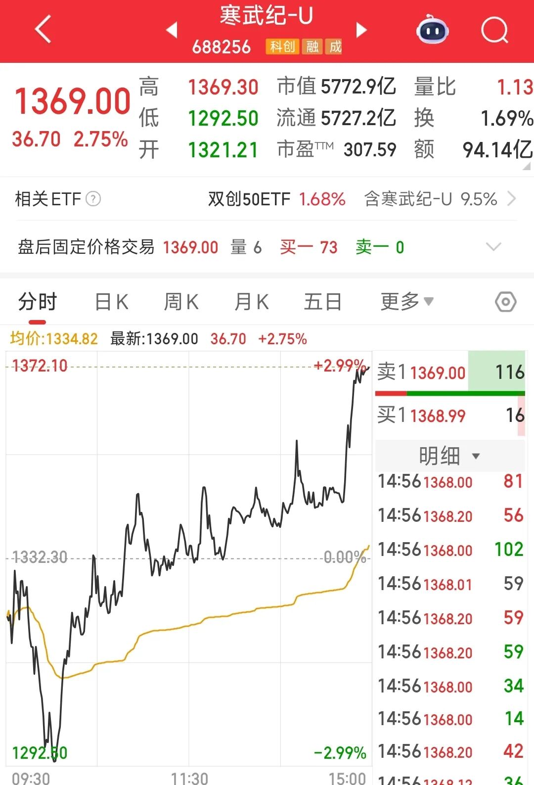 寒武纪今日尾盘短线拉升,截至收盘,涨2.75%。
